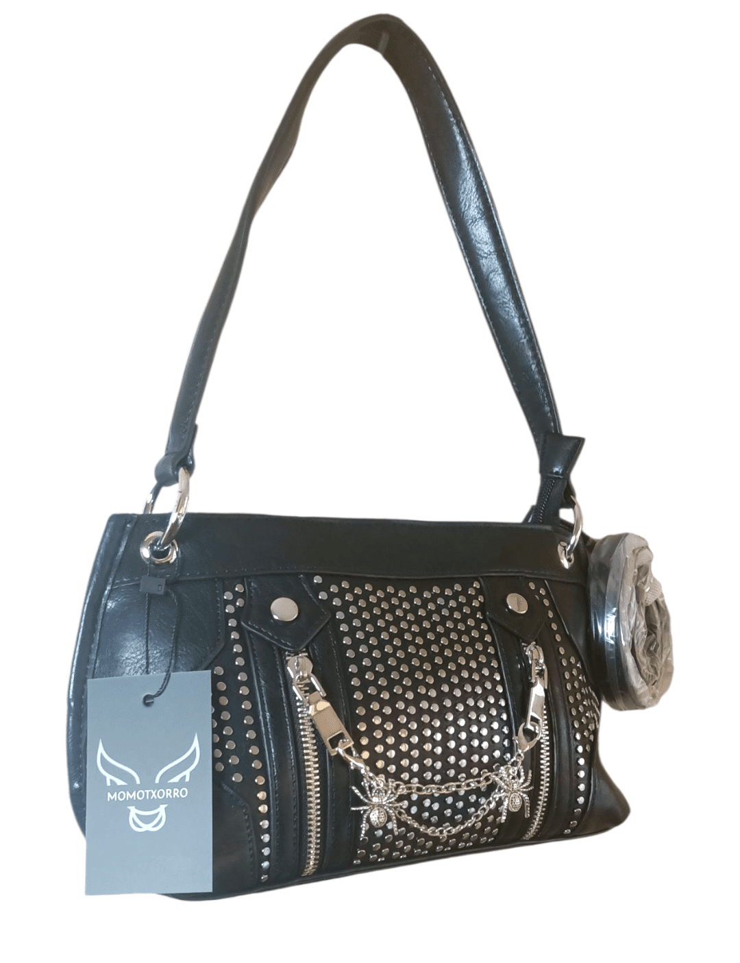 🕸️Black Widow es el bolso que encarna la elegancia oscura con un giro punk. Fabricado en piel sintética negra, sus medidas de 32x17x10 cm lo hacen compacto pero con presencia. Las tachuelas plateadas, las cremalleras verticales y la cadena con dos arañas metálicas lo convierten en un accesorio provocador.