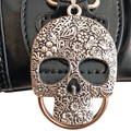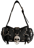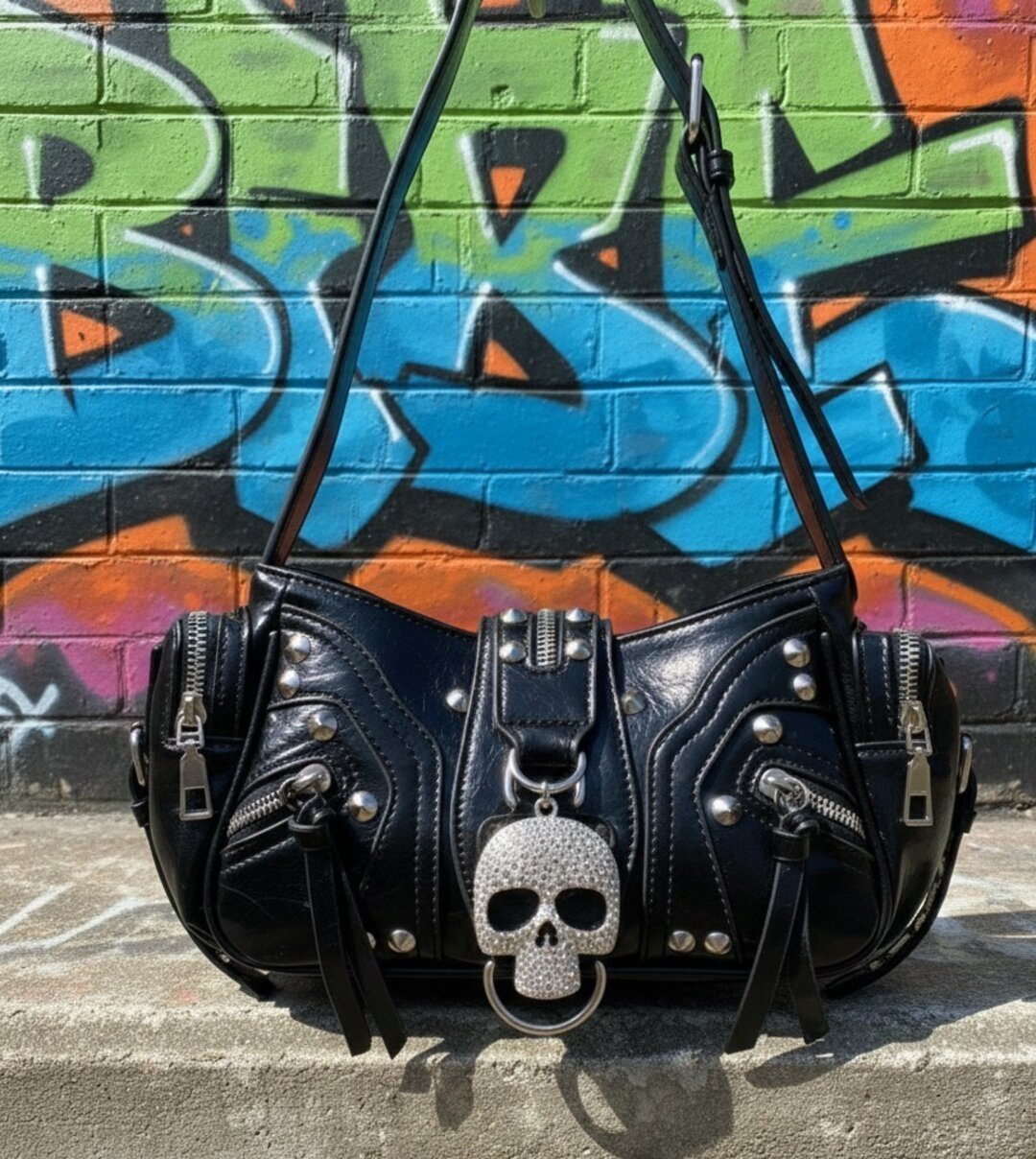 💀 Fabricado en piel sintética negra con acabado brillante, este bolso estructurado destaca por sus cremalleras decorativas, tachuelas metálicas y un colgante central en forma de calavera plateada con detalles intrincados. Las hebillas, los trenzados y los herrajes metálicos refuerzan su carácter alternativo.