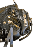 ❣️ Fabricado en piel sintética negra con brillo de alta calidad, su diseño compacto se realza con tachuelas metálicas, cremalleras decorativas y un corazón rojo enmarcado en plata que late con energía rebelde. Ideal para quienes viven la ciudad con intensidad y buscan destacar con un look único.