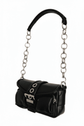 ❣️Hooked es un bolso urbano con estética Y2K y actitud punk-glam. Fabricado en piel sintética negra (también disponible en blanco), destaca por su estructura semi rígida, acabados plateados, cierre frontal con hebilla metálica y una cadena gruesa que aporta fuerza visual. El adorno de corazón añade un contraste emocional que lo convierte en un accesorio único. Se puede llevar en la mano o al hombro gracias a su correa acolchada y cómoda.