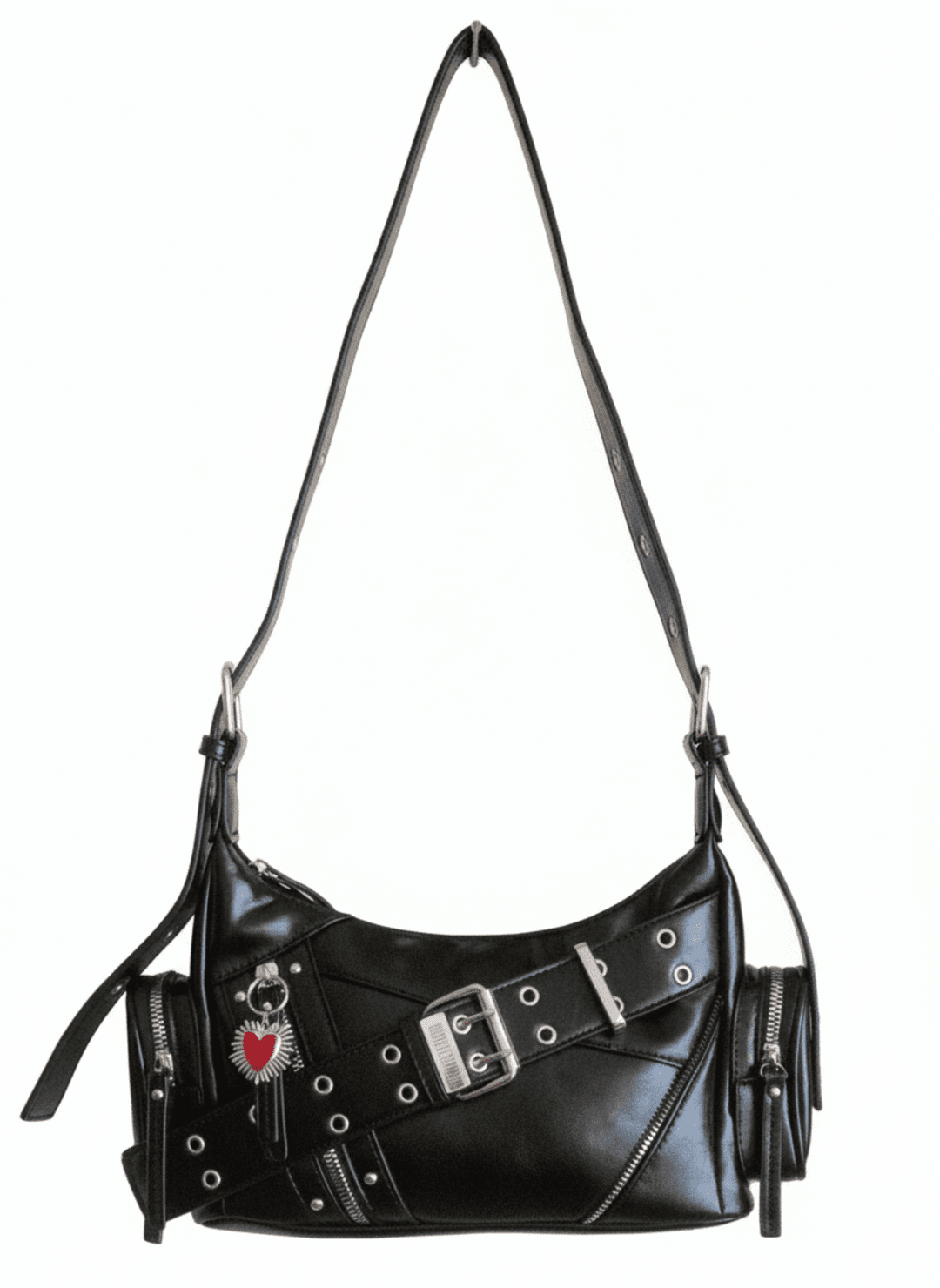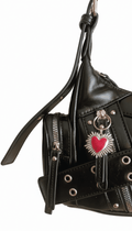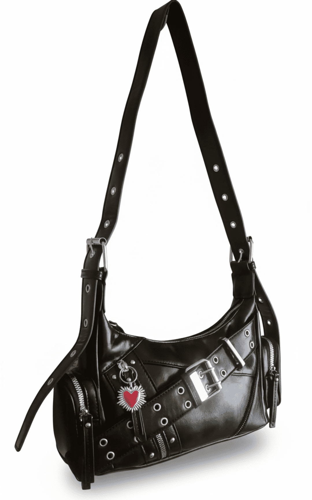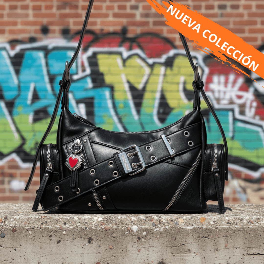 ❣️Metal Love es un bolso urbano con estética Y2K y actitud punk. Fabricado en piel sintética negra, destaca por sus acabados plateados, el cinturón decorativo con hebilla metálica, los múltiples ojales y cremalleras, y un adorno de corazón que aporta contraste y personalidad. Su diseño compacto y funcional lo hace perfecto para llevar al hombro o como bandolera gracias a su correa ajustable.