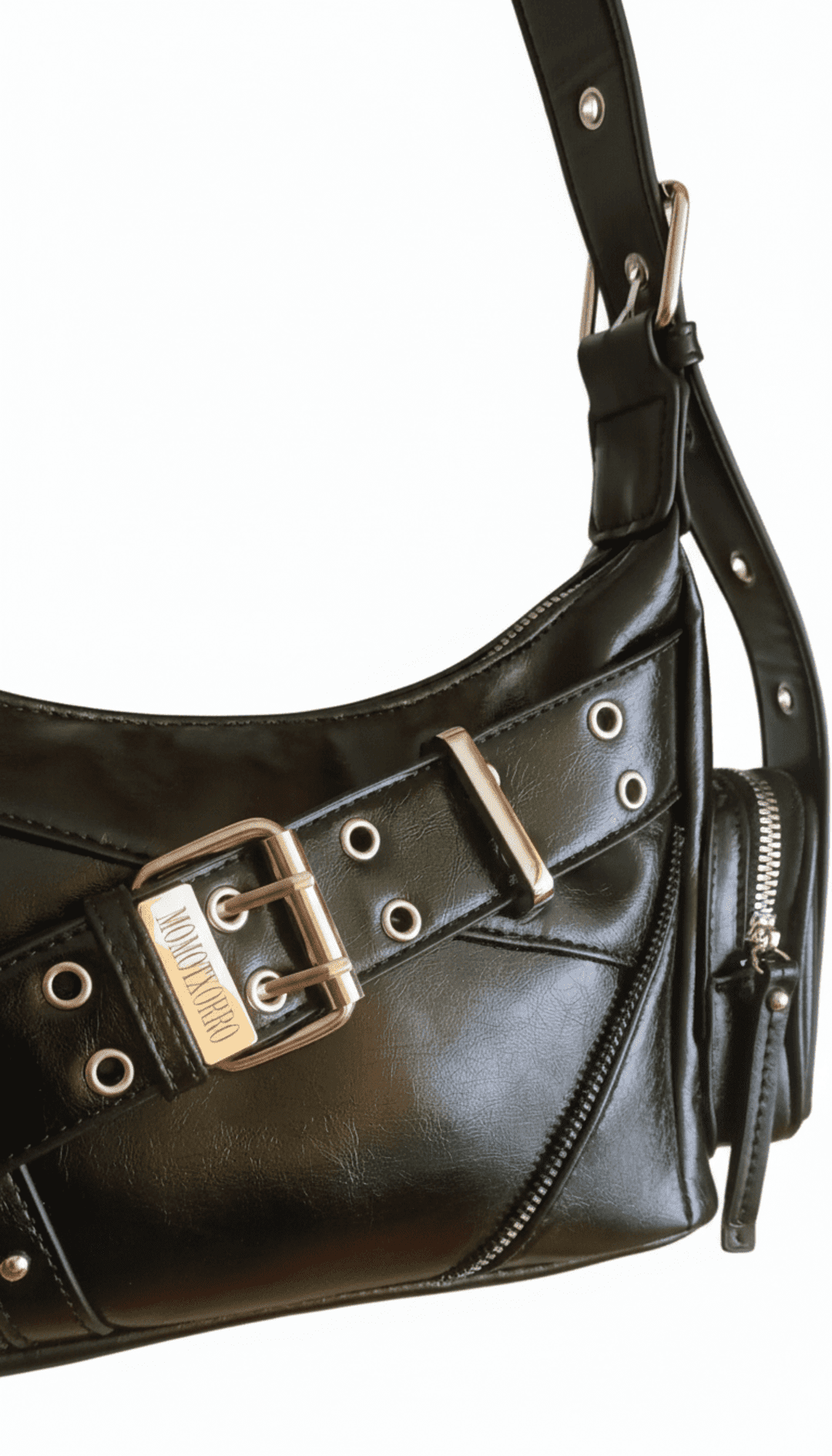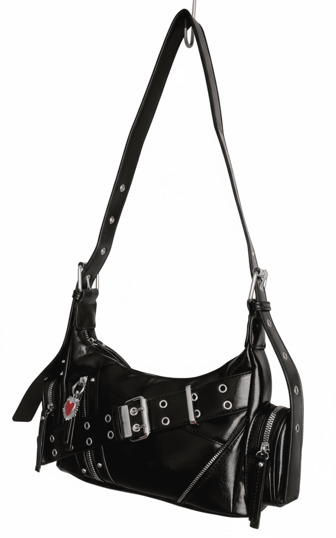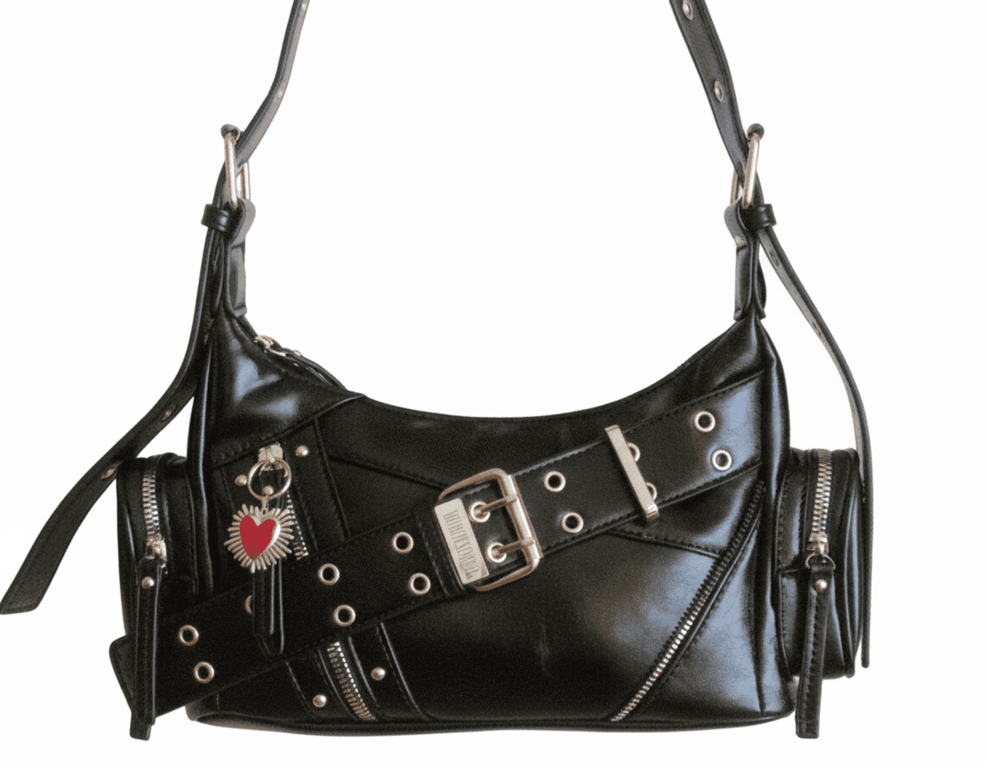 ❣️Metal Love es un bolso urbano con estética Y2K y actitud punk. Fabricado en piel sintética negra, destaca por sus acabados plateados, el cinturón decorativo con hebilla metálica, los múltiples ojales y cremalleras, y un adorno de corazón que aporta contraste y personalidad. Su diseño compacto y funcional lo hace perfecto para llevar al hombro o como bandolera gracias a su correa ajustable.