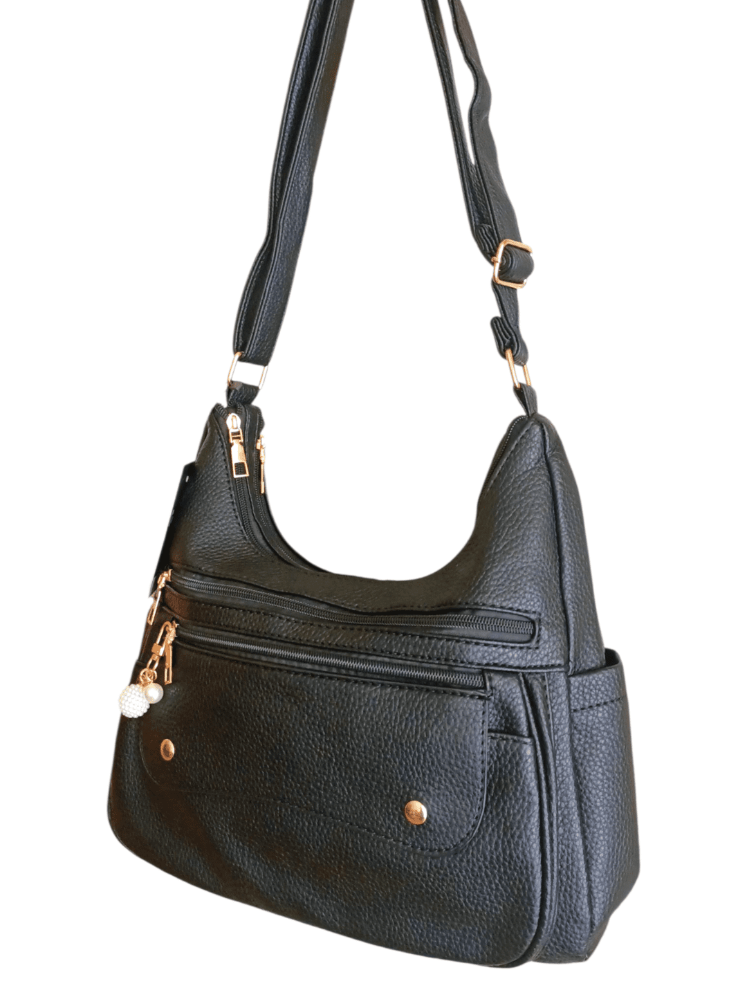 💓Pearl Trigger es el bolso que dispara estilo con cada detalle. Fabricado en piel sintética negra con textura marcada, cuenta con dos bolsillos frontales con cremalleras, un compartimento con solapa y botones dorados, y un charm decorativo con perla. Su correa ajustable y herrajes dorados lo convierten en el aliado perfecto para looks urbanos con actitud.