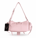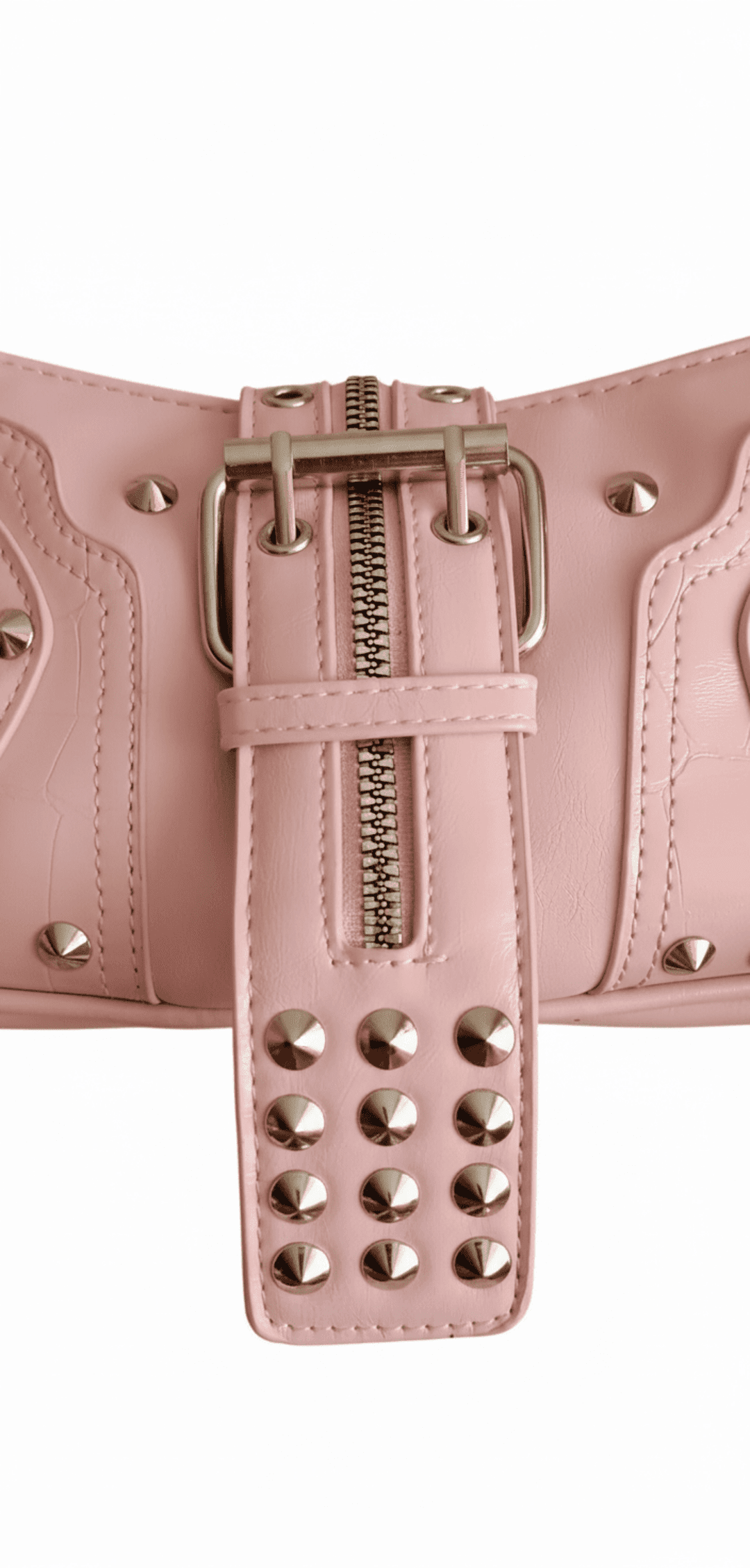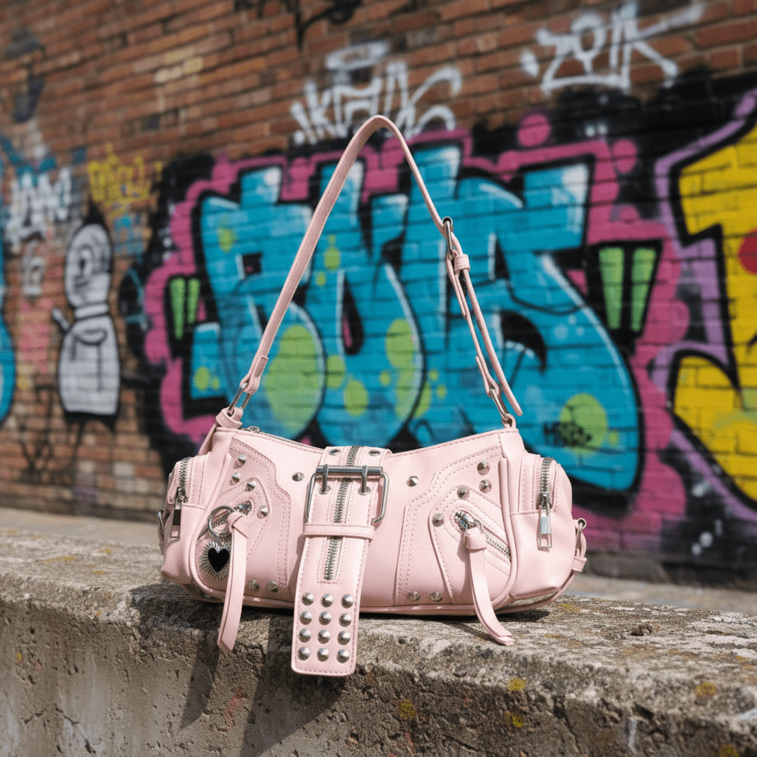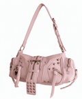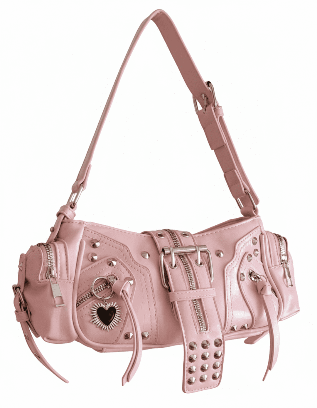 💗Pink Lip es un bolso urbano con estética Y2K y un toque glam‑punk irresistible. Fabricado en piel sintética rosa, combina tachuelas, cremalleras y hebillas plateadas con un adorno de corazón plateado y negro que aporta contraste y actitud. Su diseño semi cilíndrico y compacto lo hace perfecto para llevar en el hombro o en la mano gracias a su correa ajustable.