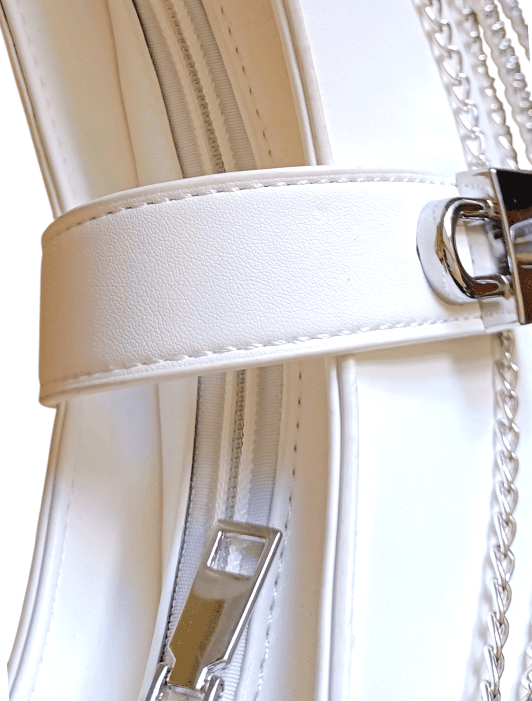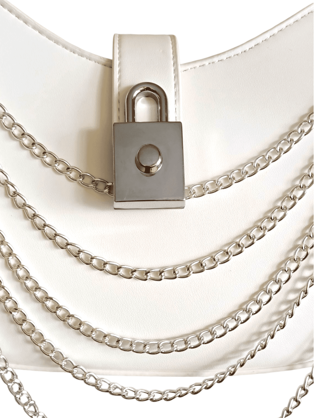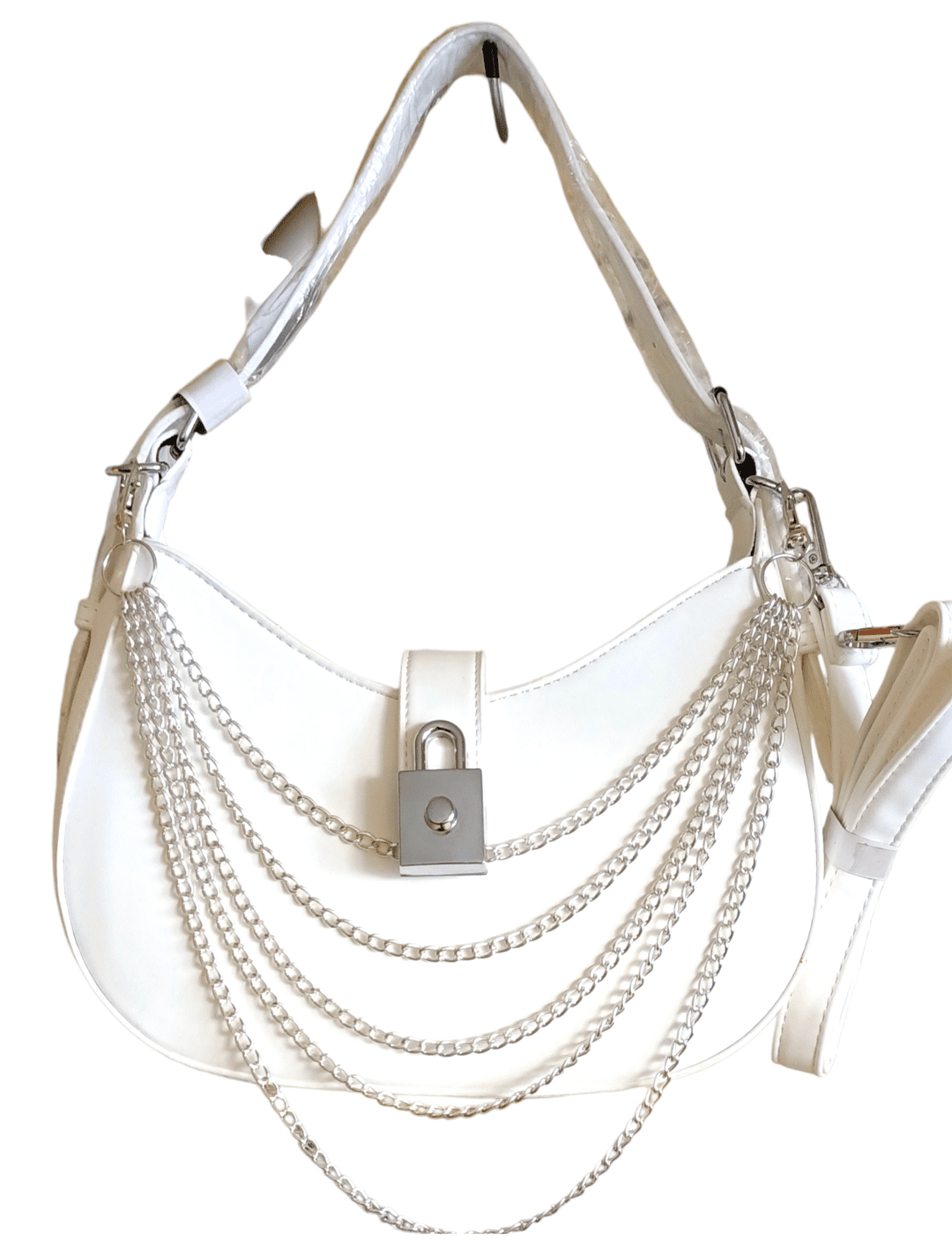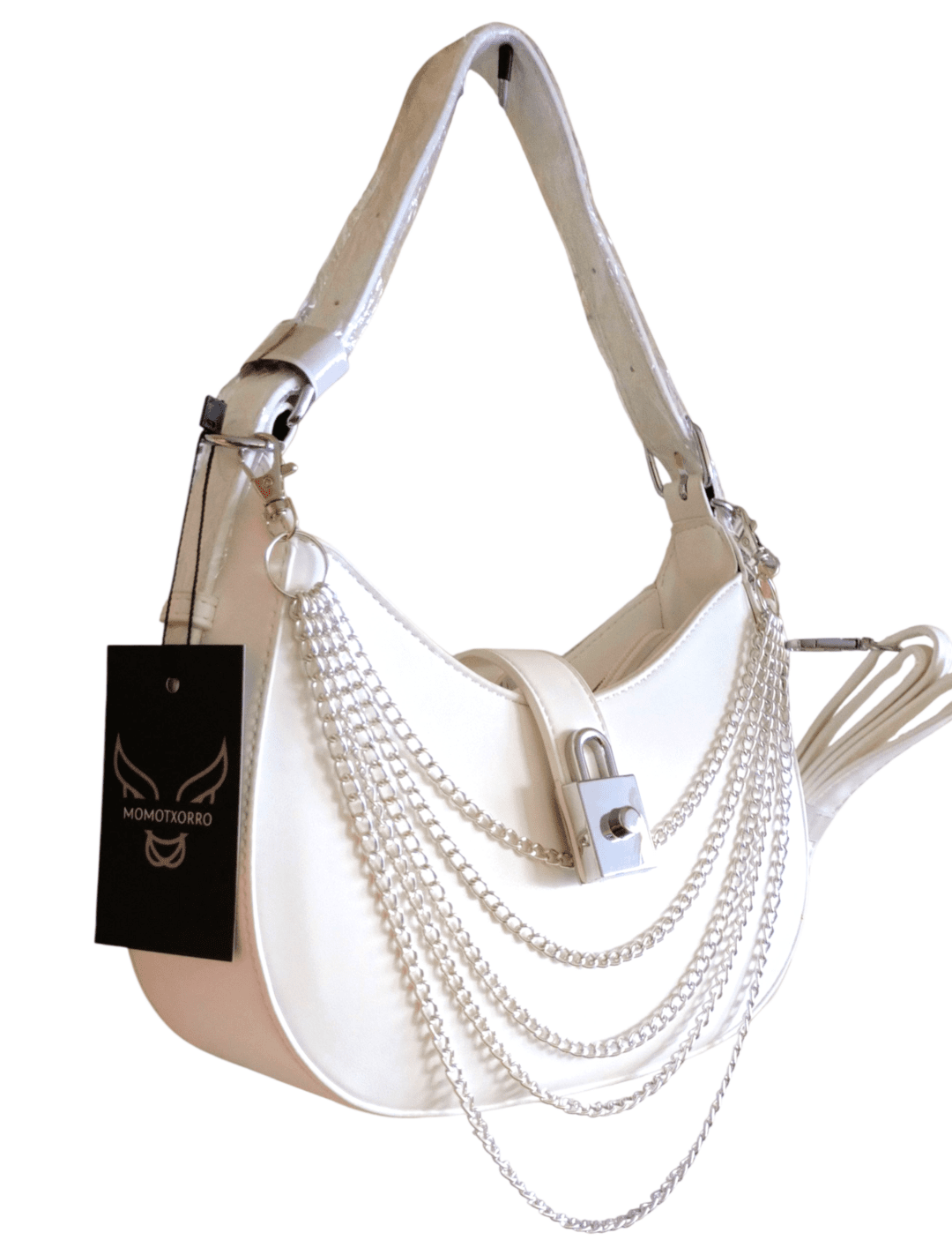 👻Silver Ghost es el bolso que combina nostalgia Y2K con elegancia futurista. Fabricado en PU blanco con detalles plateados, sus cadenas frontales y el candado decorativo le dan un aire rebelde y sofisticado.